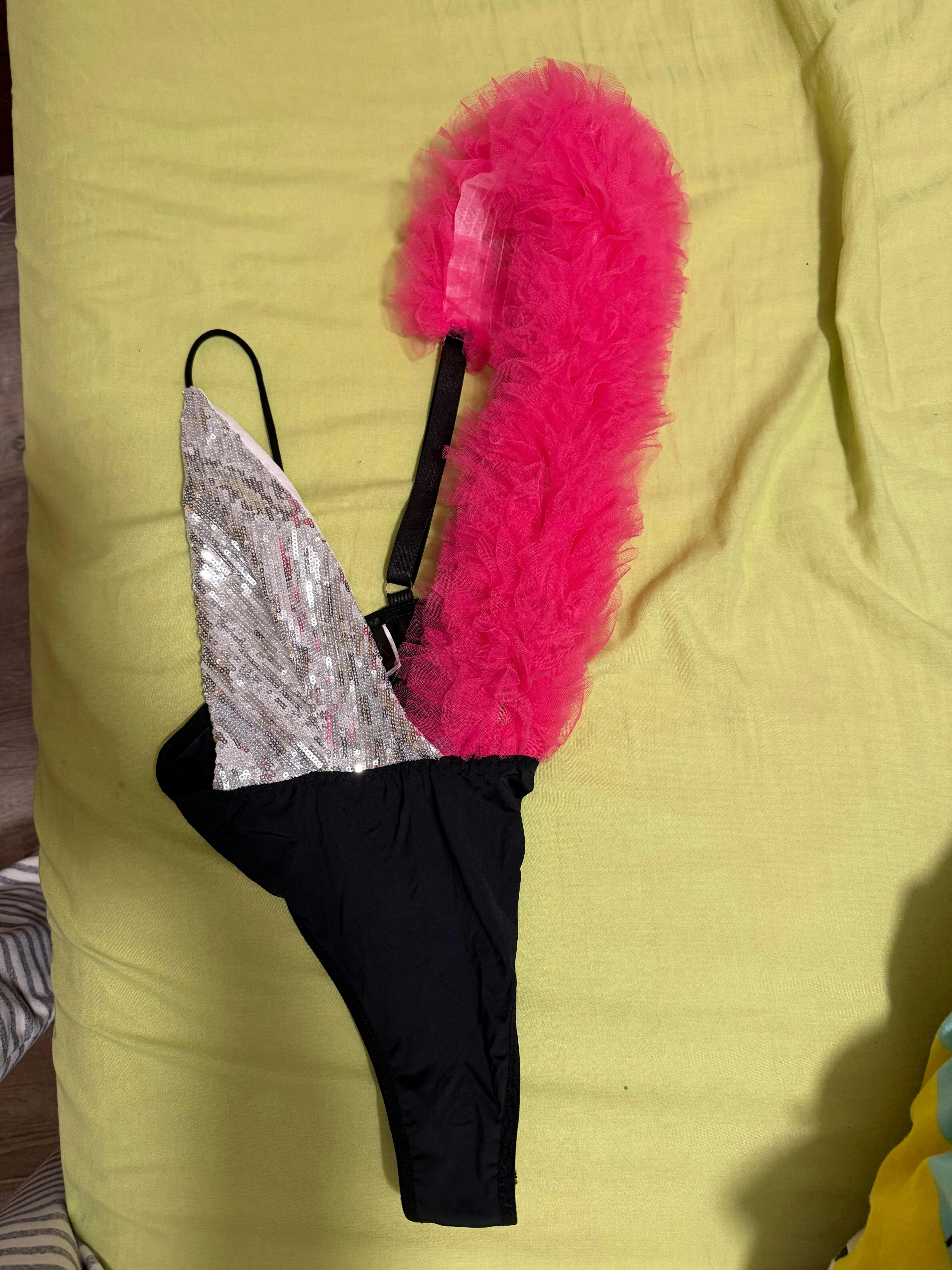 Black bodysuit with one side in silver sequins and the other in vibrant fuchsia. Designed in high quality polyester and tulle for a bold and comfortable look.