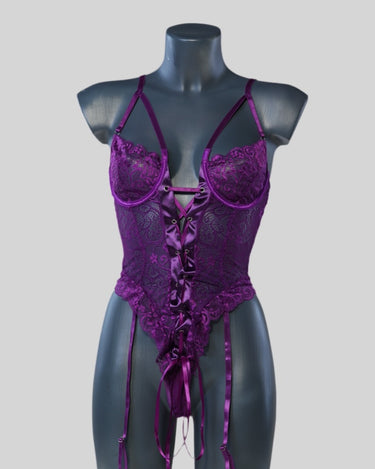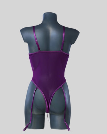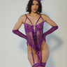 Bodysuit with lace and central bow, combined with garter belt and purple gloves. An enigmatic and seductive set, designed for those who have an indomitable spirit within.