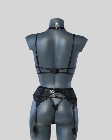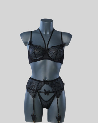 Black sheer fabric set with BUTTERFLY print Includes bra, garter and panty for a mysterious and captivating look. Excellent quality materials guarantee comfort and durability.