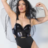 A stunning black bodysuit with sequins in the shape of a corset. Designed to enhance the figure with a perfect fit.