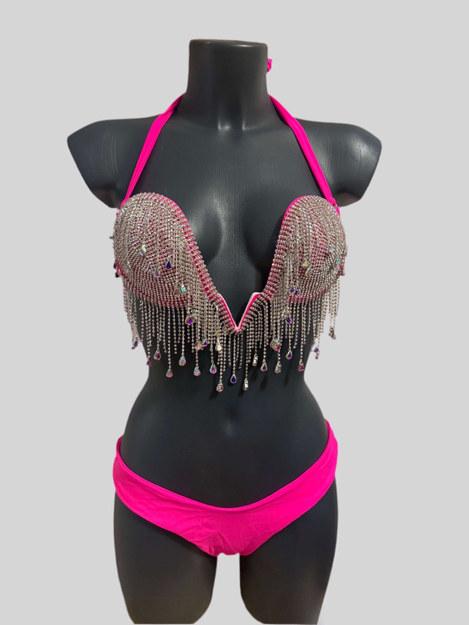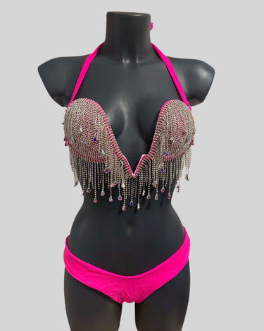 The top is crafted with sparkling rhinestones and dangling diamond-like crystals, creating a sparkling effect with every movement. The cut enhances the bust and adds a sensual and sophisticated touch, while the mid-rise bottom in vibrant fuchsia provides comfort and a perfect fit.
