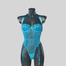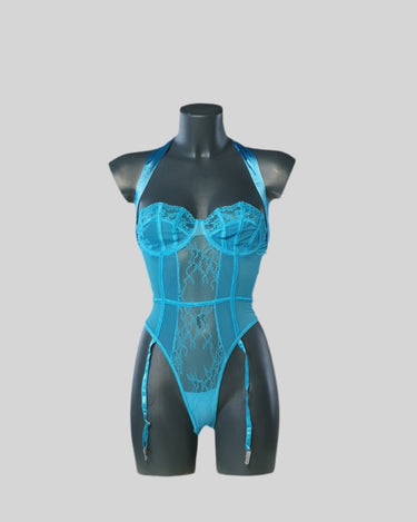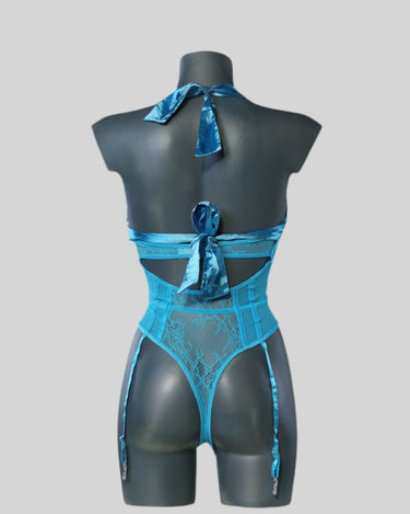 A blue top with delicate sheer details and bows on the shoulders, combined with straps and matching panties. This polyester and lace set stands out for its femininity and sensuality.