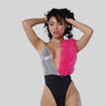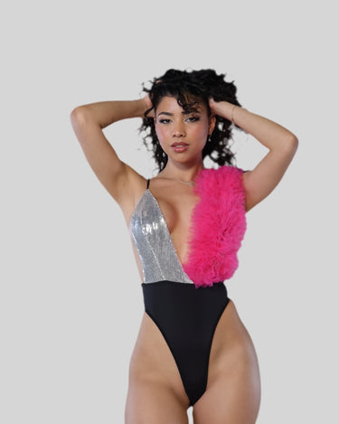 Black bodysuit with one side in silver sequins and the other in vibrant fuchsia. Designed in high quality polyester and tulle for a bold and comfortable look.