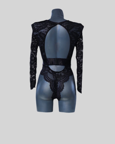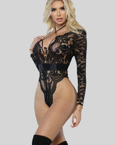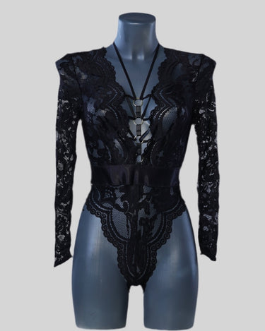 Elegant long-sleeved bodysuit with vine embroidery and black fabric belt to mark the silhouette.