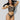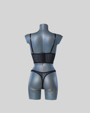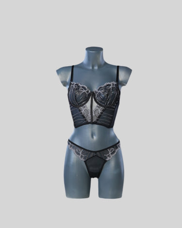 Black and gray corset with transparencies and embroidery in the shape of bows, ideal for a sophisticated style.